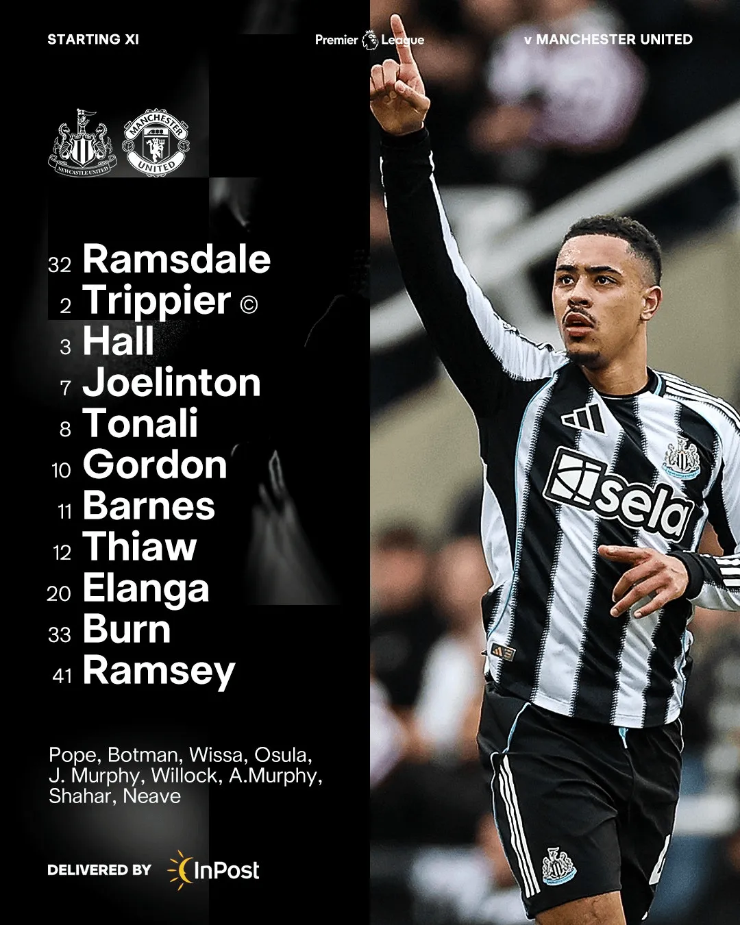 纽卡斯尔联首发:32-拉姆斯代尔、2-特里皮尔、3-刘易斯-霍尔、12-佳夫、33-丹-伯恩、41-雅各布-拉姆齐、8-托纳利、7-乔林顿、11-哈维-巴恩斯、20-埃兰加、10-安东尼-戈登